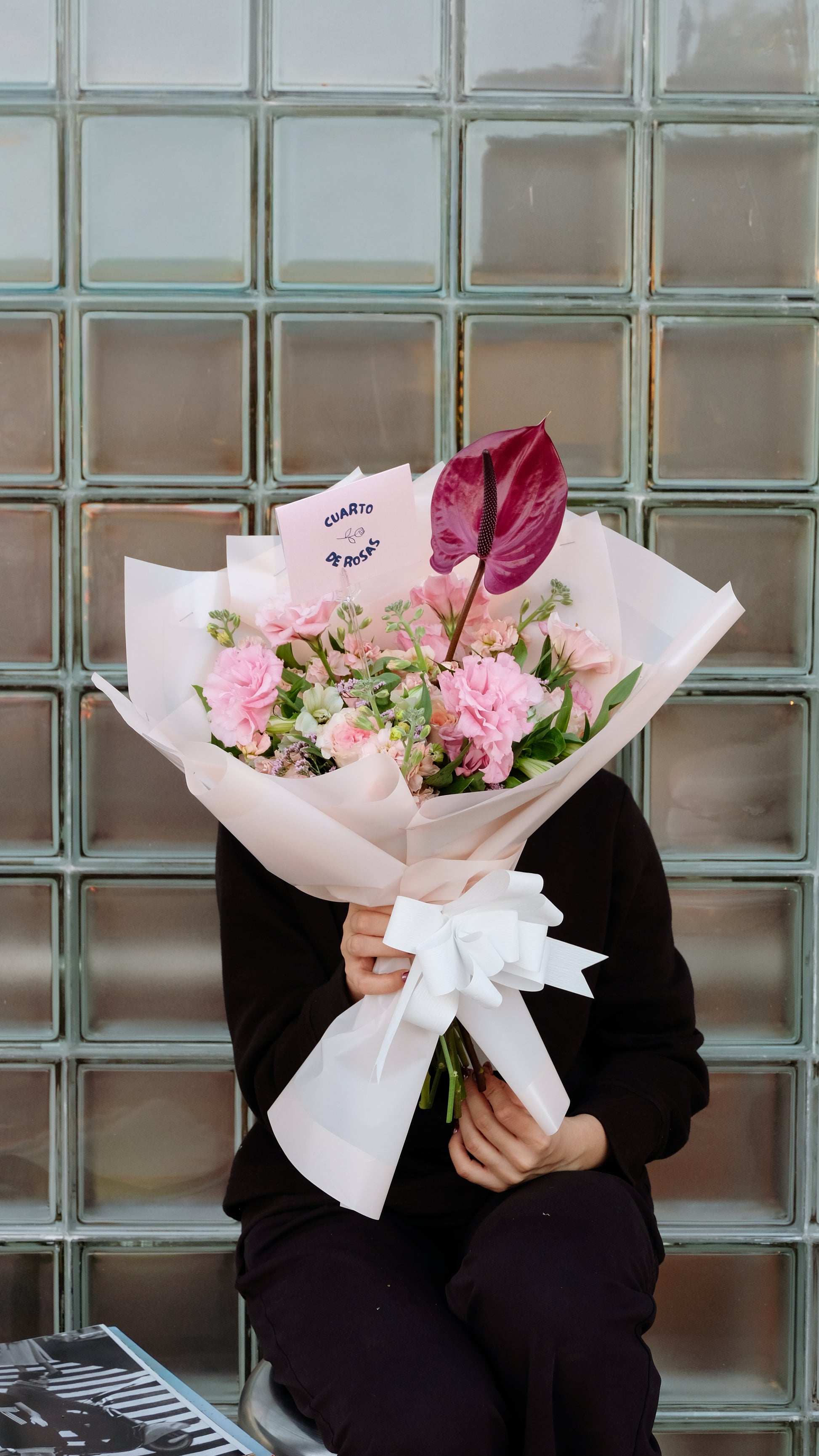Ramo 10 rosas rosadas + anturio + flores de acompañamiento.
